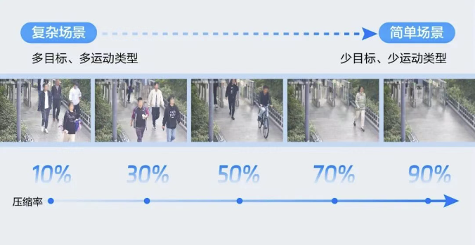 例如:目標較多、運動幅度大的復雜場景(如早高峰地鐵站)保留90%以上碼率,保障信息完整性;靜止重復的簡單場景(如深夜靜止畫面)僅用10%左右碼率,壓縮率可高達90%。