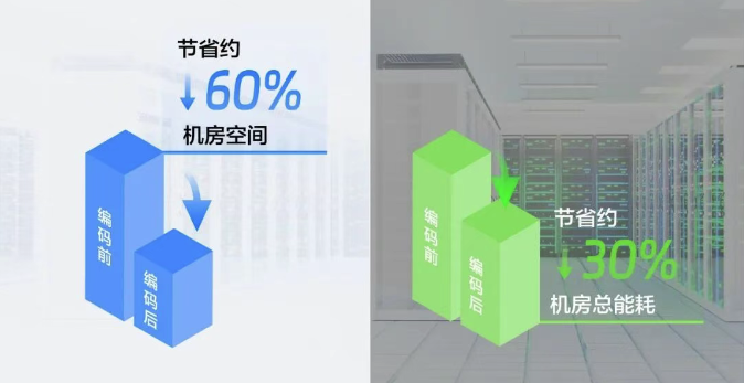 從存儲資源,到機房運營,全鏈路省預算。以1000路規模1080P@2Mbps,90天存儲為例,通用場景下存儲空間大概能省60%,能源消耗節省30%以上。