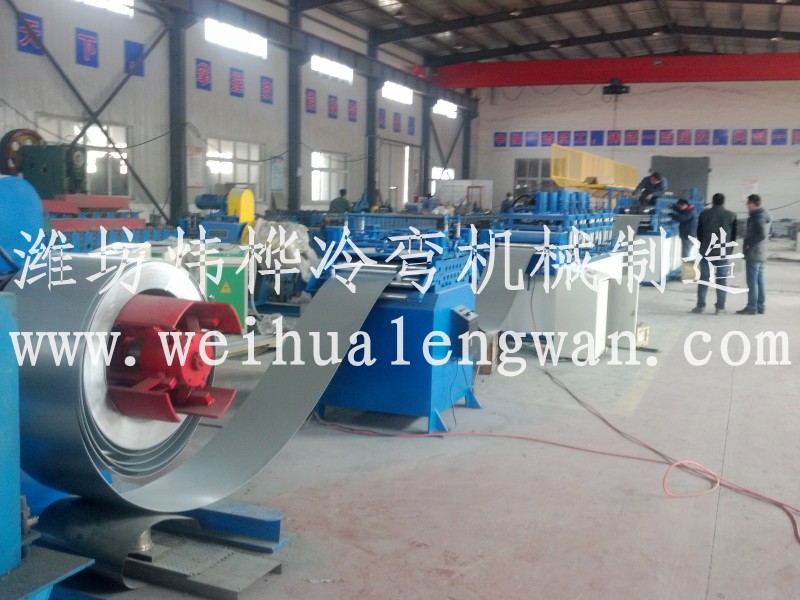 自動(dòng)放料機(jī)、校平、送料部分、連續(xù)沖孔部分、成型部分、定尺切斷部分、收料臺(tái)、三邊折彎成型機(jī),電器控制柜等部件組成。