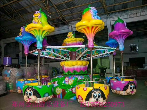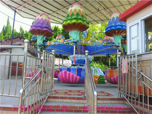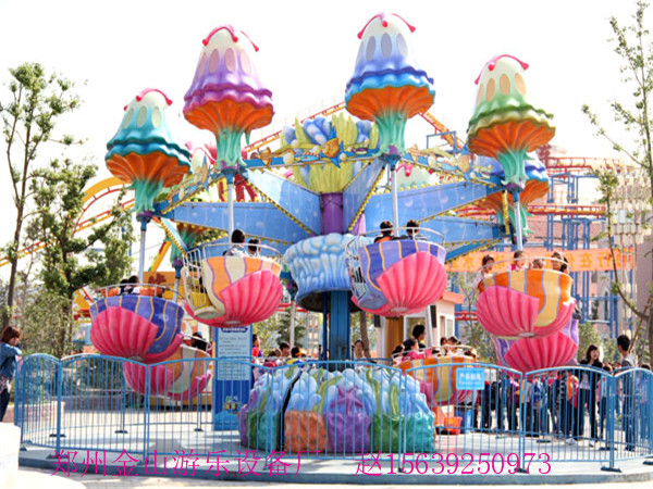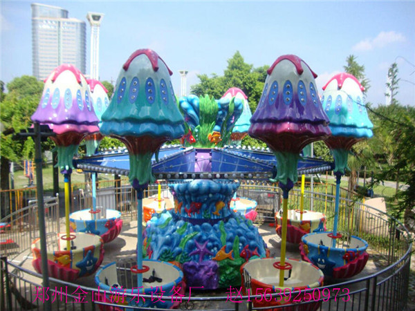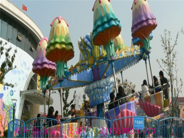 逍遙水母是金山推出的另一款氣氛熱烈的游樂項(xiàng)目。該項(xiàng)目由兩個(gè)旋轉(zhuǎn)、一個(gè)搖頭、一個(gè)自轉(zhuǎn)運(yùn)動(dòng)迭加而成,游客可自行控制彩杯的旋轉(zhuǎn),一次可供32名小童游玩,場面恢宏、效益頗佳。該設(shè)備占地10米直徑,是中小型游樂場的理想項(xiàng)目。