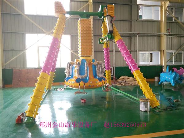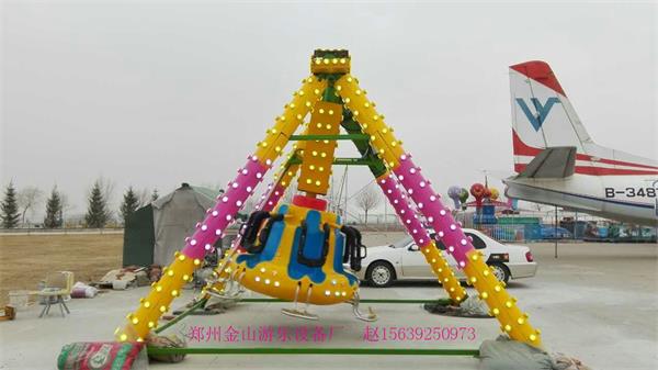 工作原理:設備由主支架、吊掛裝置、擺錘、電氣系統組成。擺錘的主體部分采用桁架結構,擺錘外殼為玻璃鋼,擺錘上裝有座席、安全壓桿,保證游客的安全乘坐。擺錘的主傳動采用了電機帶動回轉支承的驅動方式,使電機驅動時能對擺錘的擺動靈活跟蹤,實現非勻速轉動。采用氣缸使用權擺錘實現大幅度擺動。擺錘配有功能齊全的電氣柜和輔助電器,能確保電機的啟動和安運行,電氣柜裝有驅動裝置的控制電路、電鈴按鈕,使用非常簡便、安全