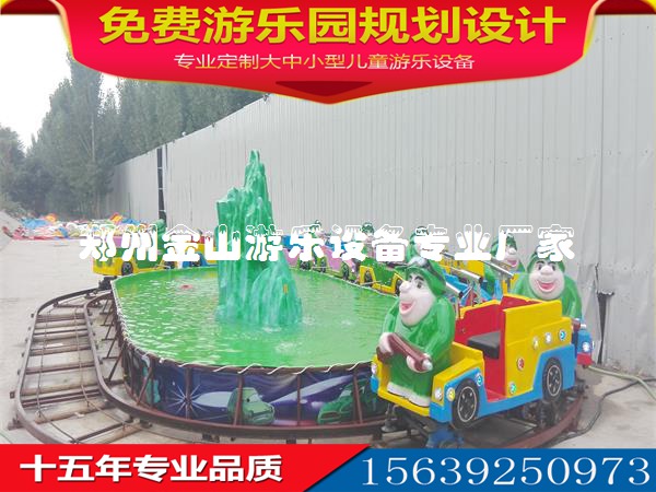 水陸戰車屬于軌道類兒童游樂設備,設備軌道中間有簡易水池,乘客乘坐在戰車內,用戰車內的水槍可射擊設備中心的假山或者動物,配合逼真的聲音特效,使人有一種置身與真實戰場般的感覺,其樂無窮,留戀忘返。