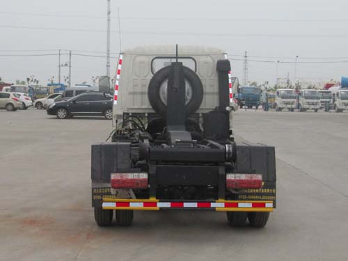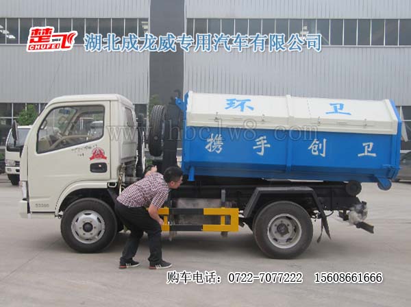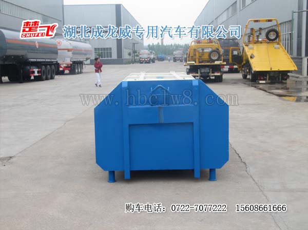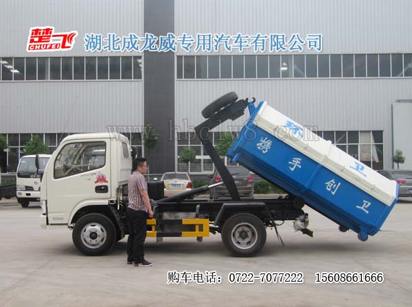 車廂可卸載式垃圾車,又稱勾臂式垃圾車、拉臂式垃圾車。該車廣泛適用與城市街道學校垃圾處理,可一車配備多個斗,各個垃圾點放置多個垃圾斗,帶自卸功能,液壓操作,方便傾倒。該車的箱體部分完全由液壓系統來控制,在平日里可將車載垃圾箱放置到各個垃圾收集站,待垃圾收集滿后,該車可直接開赴至垃圾站,通過液壓系統的操控,可將垃圾車后座上加裝的勾臂放下,掛住站內垃圾箱前端的連接點,將垃圾箱拉至車體的后座上,此時即可啟動車輛,將垃圾運送至垃圾處理站內,進行自卸式傾倒。該車最主要的優點就是可一車配多斗,一輛車就可以維持數個垃圾收集站的運轉,效率高,且箱體為密封式設計,不會造成二次污染。