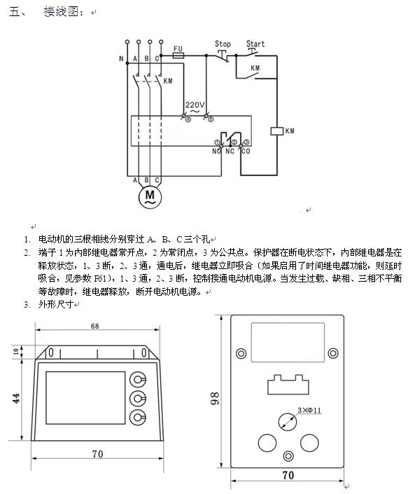 通過內置的電流互感器檢測負載電流,所以被保護電機的三根相線必須分別穿過電流互感器的三個小孔。