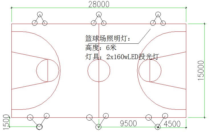 布置方案:6套燈具分布于兩側,主要照射范圍集中在球場籃球架區域保證籃球場進攻區的照明,可保證一般比賽、球隊訓練要求。