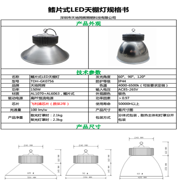 5、配光方式多種,有60度、90度、120度燈罩;同時配備兩種PC透光件,透明和奶白防眩透光件