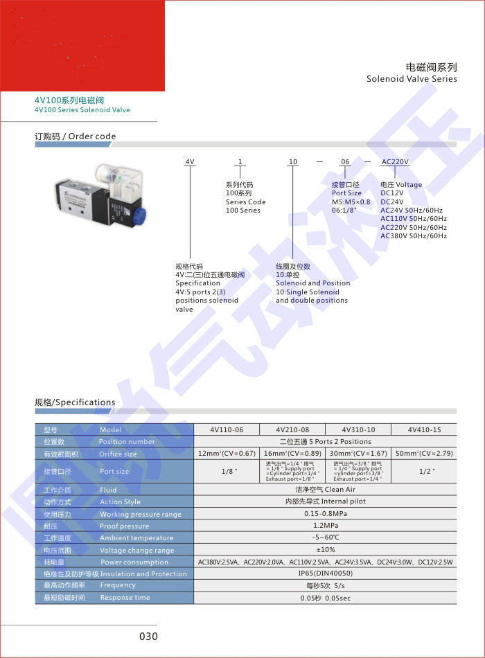 4代表電壓24V,V代表V型指氣道形狀,(4V也可能就是代表二位五通電磁閥),2是規格代號,指接口2分(即出氣口2個),10系列代號,指單頭雙位置,電控方式為單方,另一方是彈簧,08代表接管口徑 。