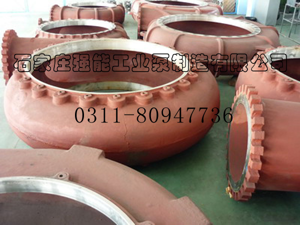過流部件中,葉輪、前護(hù)板、后護(hù)板均采用強(qiáng)抗磨高鉻合金材質(zhì),泵體采用既有優(yōu)良抗磨蝕性又能承壓的耐磨合金鋼。