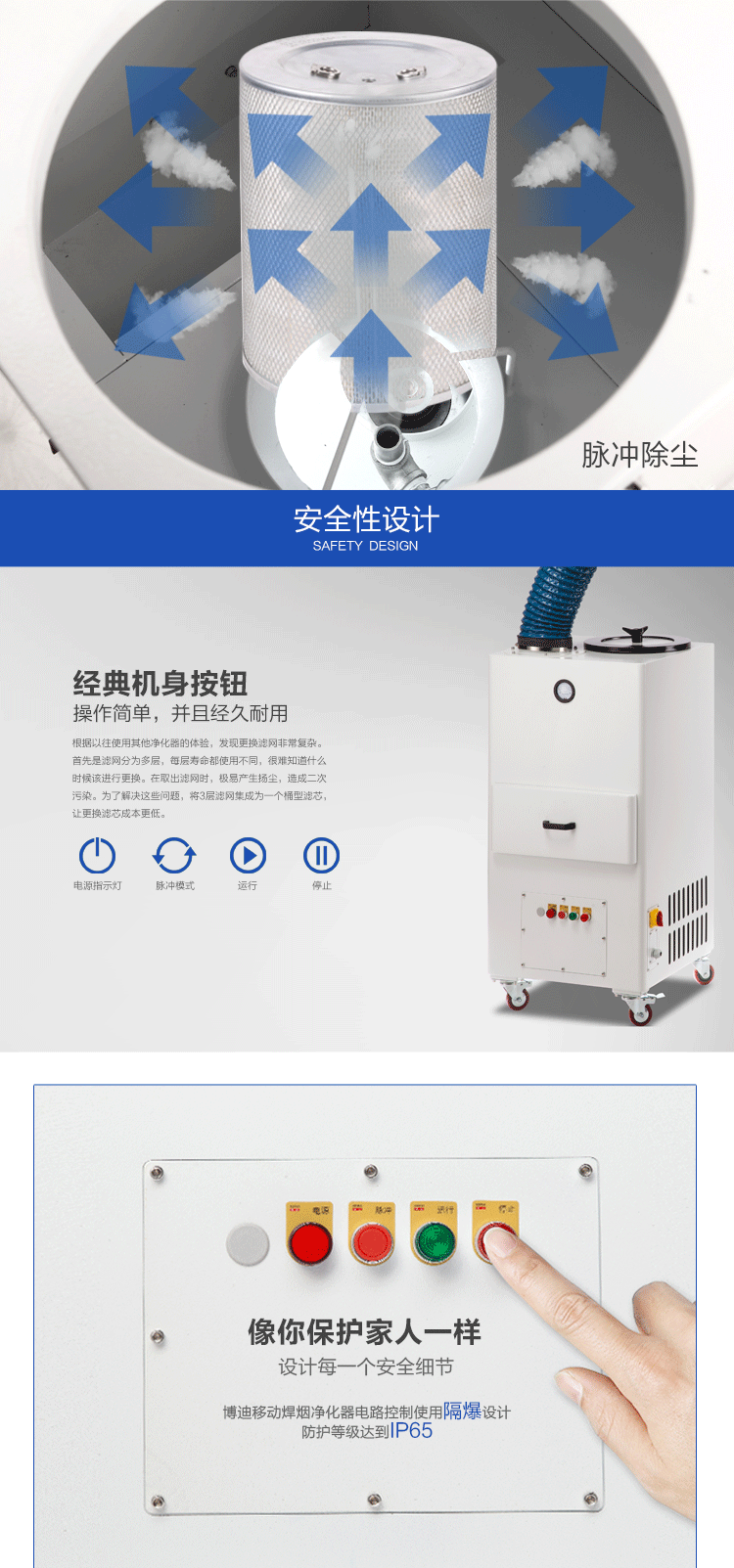 4、濾筒采用防靜電復膜聚脂纖維材質,吸附性能更高,安全性更好,過濾效果 > 99.9 % ,使用壽命長,可以吸收 0.3 μ m 的粉塵顆粒;