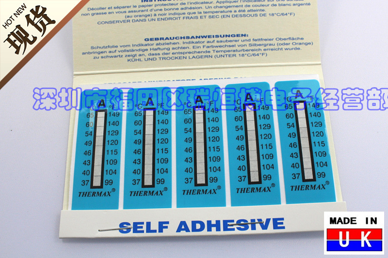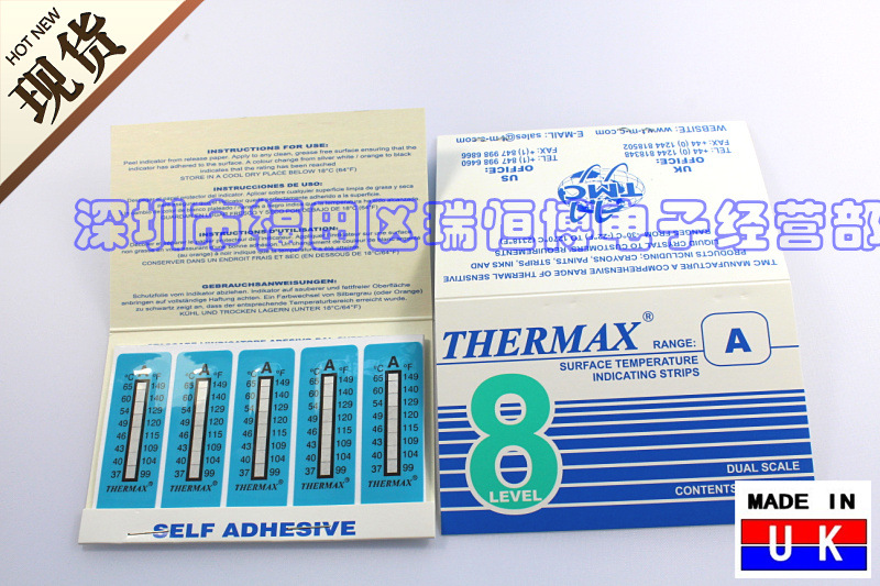 測溫紙,英國THERMAX測溫紙,英國溫度美TMC測溫測溫紙,八格A級測溫紙測溫范圍:37 40 43 46 49 54 60 65°C 攝氏度,測溫紙垂直自動粘貼式,測溫紙同時有攝氏度和有華氏度數(shù)值顯示。