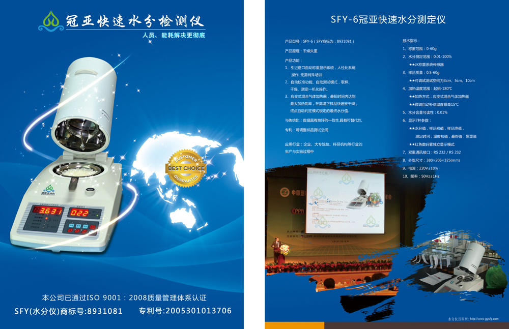 SFY-6型快速水分測(cè)定儀是由深圳冠亞公司研發(fā)并生產(chǎn),該儀器具有溫度設(shè)定、微調(diào)溫度補(bǔ)償及自動(dòng)控制等功能,采用目前國(guó)際通用的熱解原理研制而成的新一代快速水分測(cè)定儀器。引進(jìn)進(jìn)口自動(dòng)稱重顯示系統(tǒng),人性化系統(tǒng)操作,無需特珠培訓(xùn),自動(dòng)校準(zhǔn)功能、自動(dòng)測(cè)試模式,取樣、干燥、測(cè)定一機(jī)化操作。應(yīng)變式混合氣體加熱器,最短時(shí)間內(nèi)達(dá)到最大加熱功率,在高溫下樣品快速被干燥,測(cè)定精度高、時(shí)間短、無耗材、操作簡(jiǎn)便,不受環(huán)境、時(shí)漂、溫漂因素影響,無需輔助設(shè)備等優(yōu)點(diǎn)。客戶可根據(jù)所測(cè)樣品狀態(tài)不同而調(diào)整測(cè)試空間,片狀、顆粒、粉末一機(jī)操作,且檢測(cè)效率、測(cè)試準(zhǔn)確度遠(yuǎn)遠(yuǎn)高于國(guó)家標(biāo)準(zhǔn)方法。計(jì)算機(jī)、打印機(jī)連接功能可即時(shí)打印或者記錄、儲(chǔ)存終點(diǎn)自動(dòng)判定模式鎖定的最終水分值。