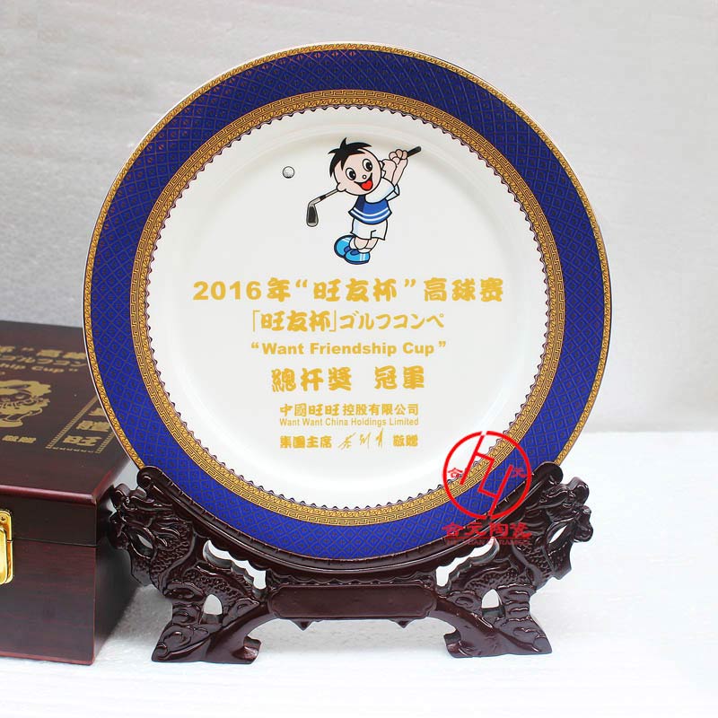 包裝:一塊頒獎陶瓷獎盤配置一個高檔瓷器錦盒包裝和一個盤架就是一套精美的陶瓷獎盤了。頒獎陶瓷獎盤適合于各種大型運動比賽、學校比賽、廚師比賽、公司活動比賽等賽場頒獎獎盤。另外本廠生產的陶瓷紀念盤,色彩豐富,款式眾多,圖案新穎,寓意非凡。陶瓷紀念盤適合各種商務禮品的贈送。