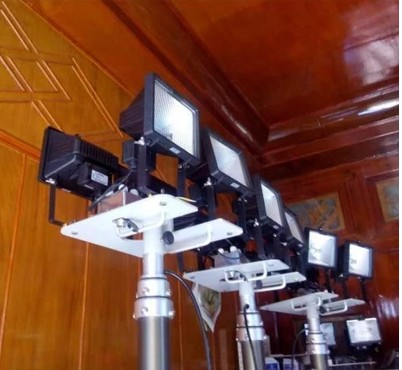 4、便操作性:通過無線遙控可在50米范圍內分別控制每盞燈的開啟和關閉,使用氣泵或手動氣閥控制伸縮桿的升降。