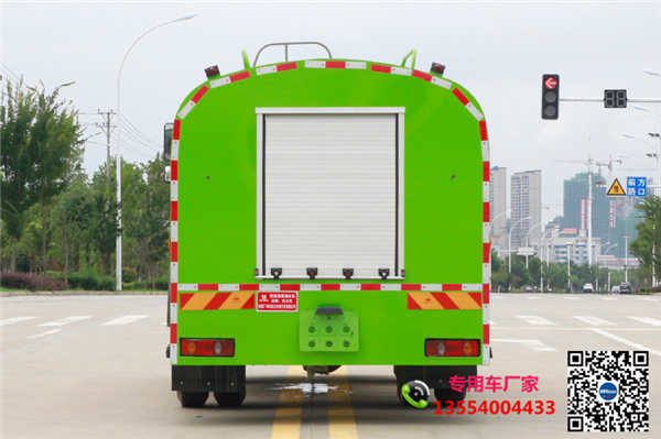 專用部分配專用灑水泵,帶前沖、后灑、側噴、后工作平臺及灑水高壓炮。配消防接口、自流閥,2根與罐體等長輸水管,水位計,1個爬梯,兩側及后杠。交通早高峰前完成主干道沖洗,單次作業覆蓋雙向8車道,耗水量18噸/公里?。