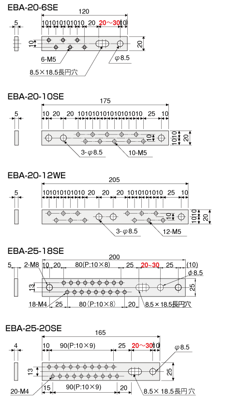 EBA-20-6SE、EBA-25-18SE、EBA-25-20SEは20mm~30mmピッチの接地端子に追加工なしで取り付け可能です。