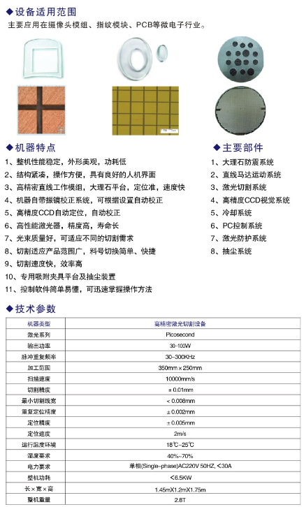 SD卡切割、攝像頭模組切割、指紋模組切割、精密金屬切割、LED陶瓷切割、藍寶石劃線、太陽能基板切割、顯示屏玻璃切割、硅晶圓切割